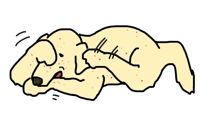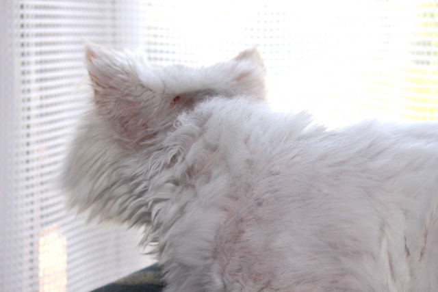 ノミに喰われた位置にかかわらず首の回り、背中や腰周りに皮膚炎を起こし、かきむしるようにかゆがります。