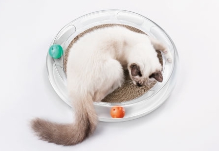 CatScratcher(キャットスクラッチャー)は、爪とぎ、ベッド、ボール遊び(鈴)、ボール遊び(西洋またたび入り)の4種類の機能が1つになった、多機能キャットトイ。付属するボールは、ネコが遊んでも外に出ないので、遊んでいるうちになくなることがない作りになっています。猫カフェに持っていって使ってみたところ、まさに猫まっしぐら!
