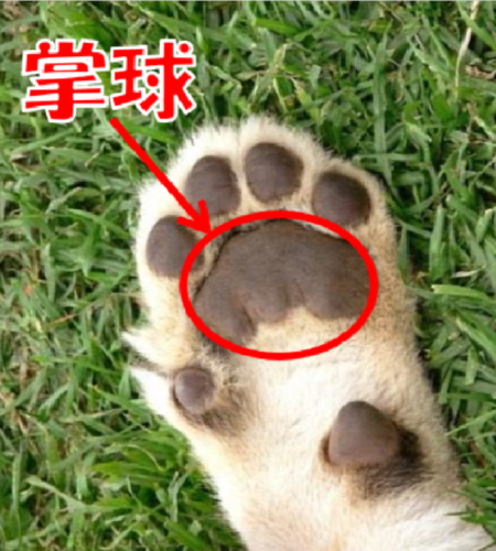 掌球(metacarpal pad)とは、前脚裏の肉球で中央にある一番大きい部分のことで、人の掌にあたる部分です。後脚裏の肉球は足底球(footpad)といいます。