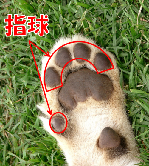 指球(digital pad)とは、前脚にある掌球の外側に並んでいる肉球のことです。また、後脚の外側に並んでいる肉球は『趾球(しきゅう)』といいます。