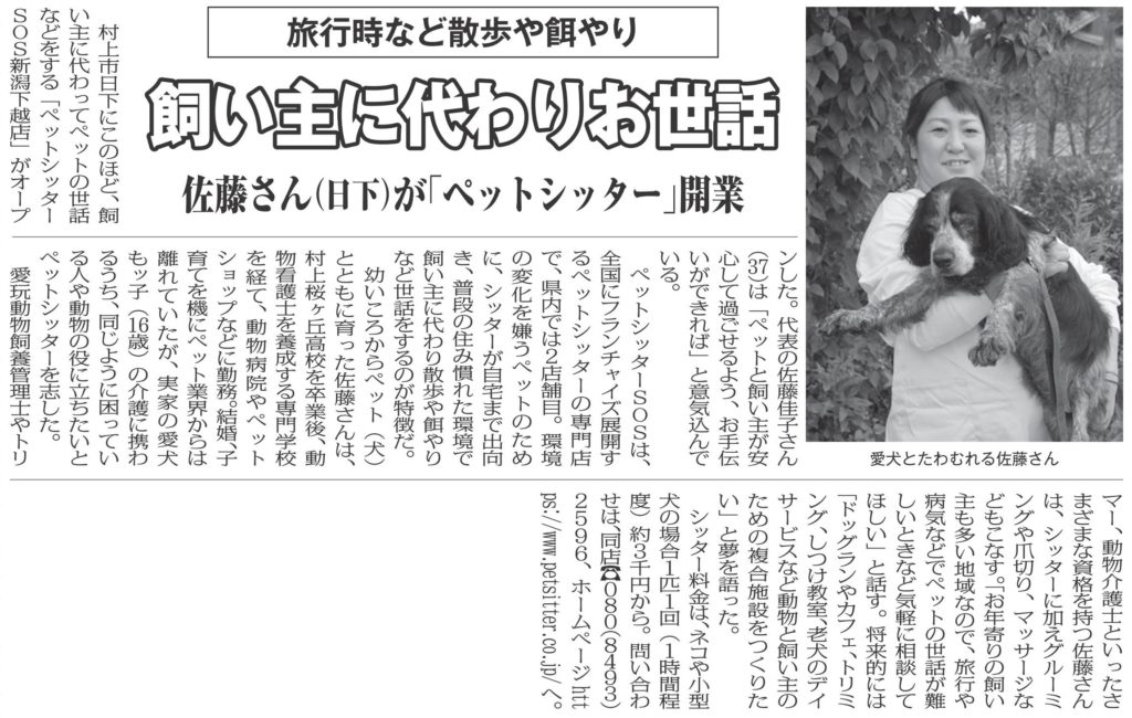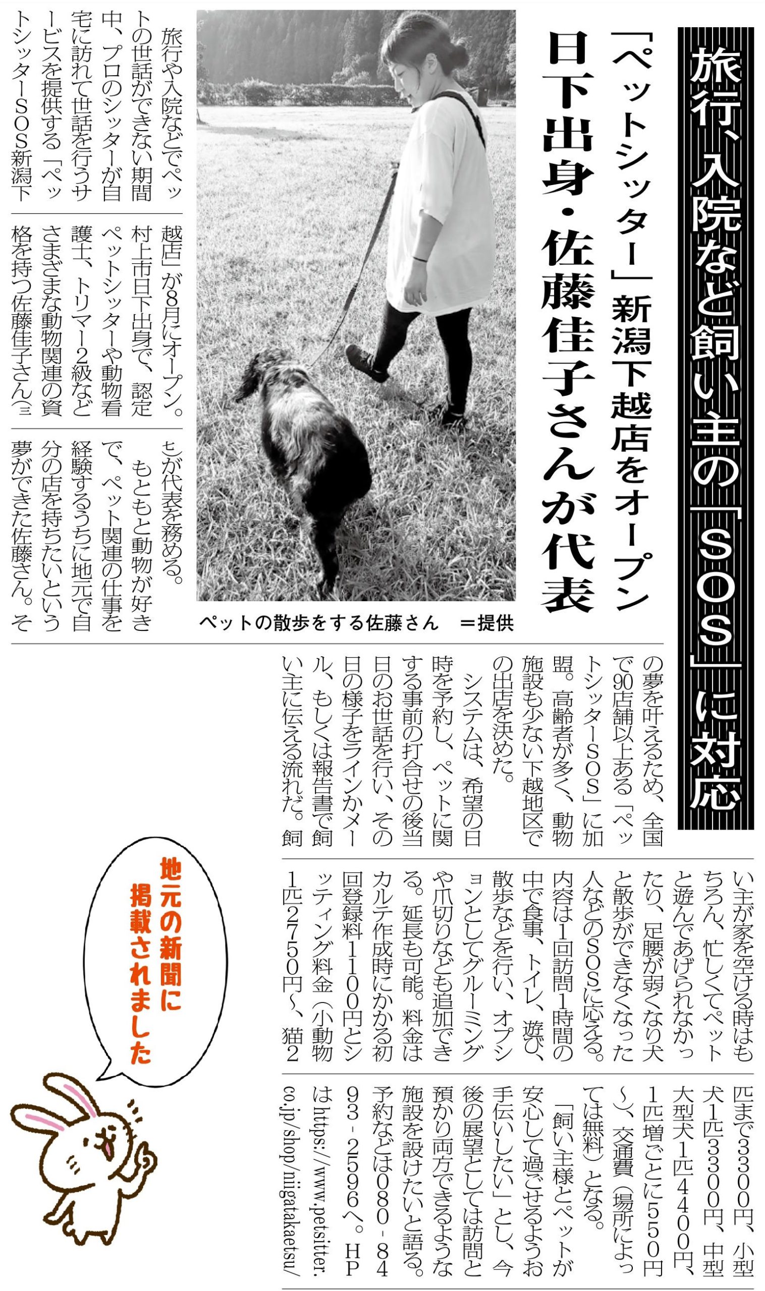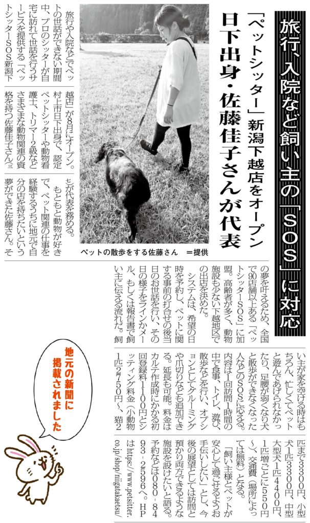 ペットシッターSOS新潟下越店は、胎内市、村上市を中心にお留守番のペットのお世話をするペットシッターです。