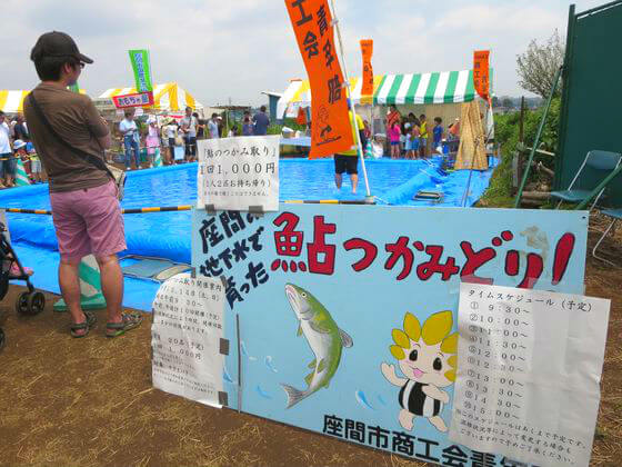 ひまわりまつりはお花の鑑賞だけではなく、アユのつかみどり体験(10日11日のみ)、模擬店の出店、特産物やひまわりの切り花の販売などもあります。
