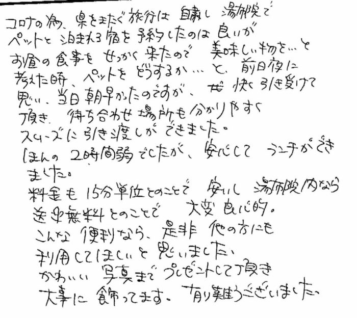 コロナの為、県をまたぐ旅行は自粛し湯布院でペットと泊まれる宿を予約したのは良いが、お昼の食事をせっかく来たので美味しい物を…と考えた時、ペットをどうするか…と、前日夜に思い、当日朝早かったのですが、快く引き受けて頂き、待ち合わせ場所も分かりやすくスムーズに引き渡しができました。