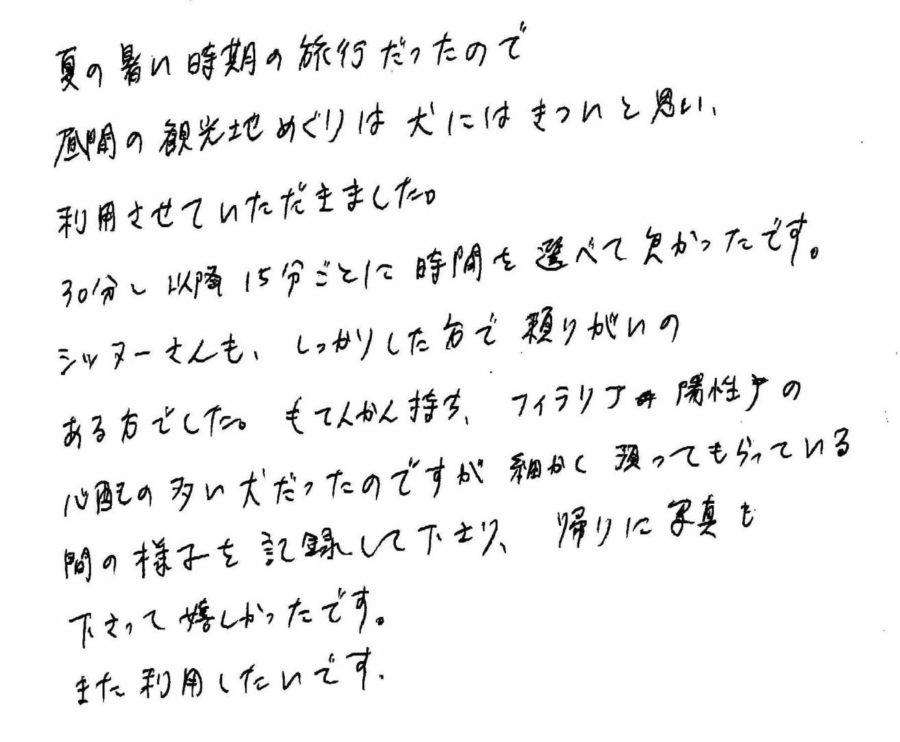 ペットシッターSOS湯布院店『一時お預かりサービス』をご利用の「お客様の声」を紹介しています