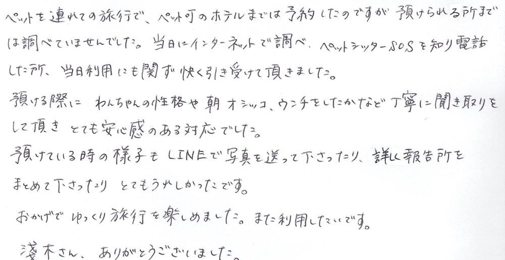 ペットを連れての旅行で、ペット可のホテルまでは予約したのですが、預けられる所までは調べていませんでした。当日にインターネットで調べ、ペットシッターSOSを知り電話した所、当日利用にも関らず快く引き受けて頂きました。