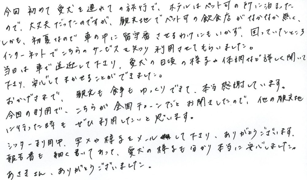 今回初めて愛犬を連れての旅行で、ホテルはペット可の所に泊まったので大丈夫だったのですが、観光地でペット可の飲食店がなかなか無く、しかも初夏なので車の中に留守番させるわけにもいかず困っていたところ、インターネットでこちらのサービスを知り利用させてもらいました。