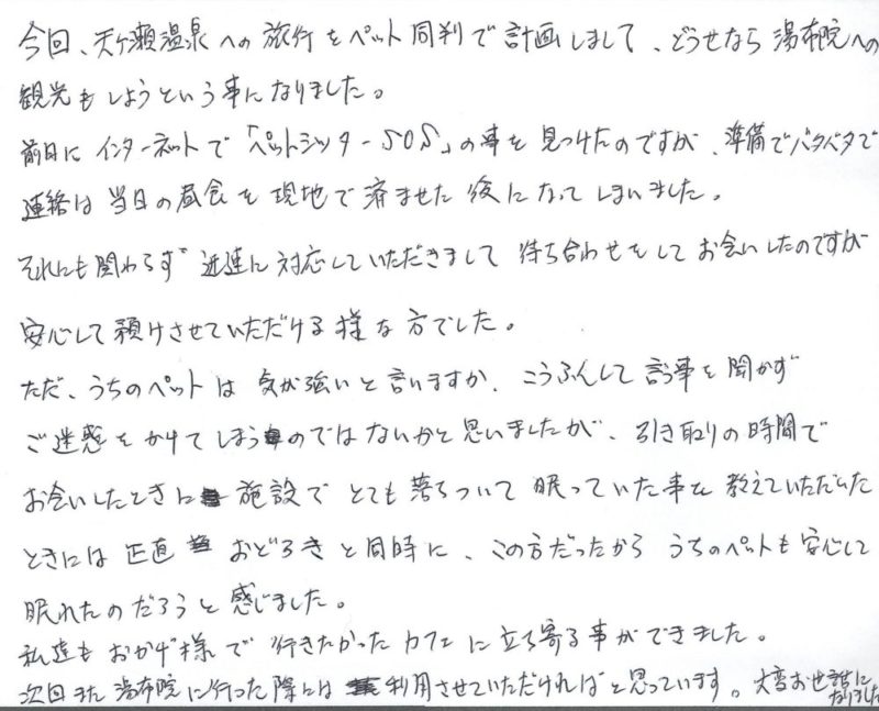それにも関わらず、迅速に対応していただきまして、待ち合わせをしてお会いしたのですが、安心して預けさせていただける様な方でした。ただ、うちのペットは気が強いと言いますか、興奮して言う事を聞かずご迷惑をかけてしまうのではないかと思いましたが、引き取りの時間でお会いしたときに、施設でとても落ちついて眠っていた事を教えていただいたときは、正直おどろきと同時に、この方だったからうちのペットも安心して眠れたのだろうと感じました。
