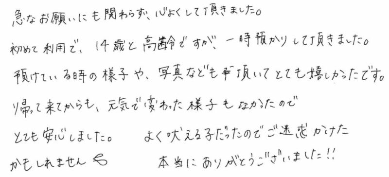 初めて利用で、14歳と高齢ですが、一時預かりして頂きました。
