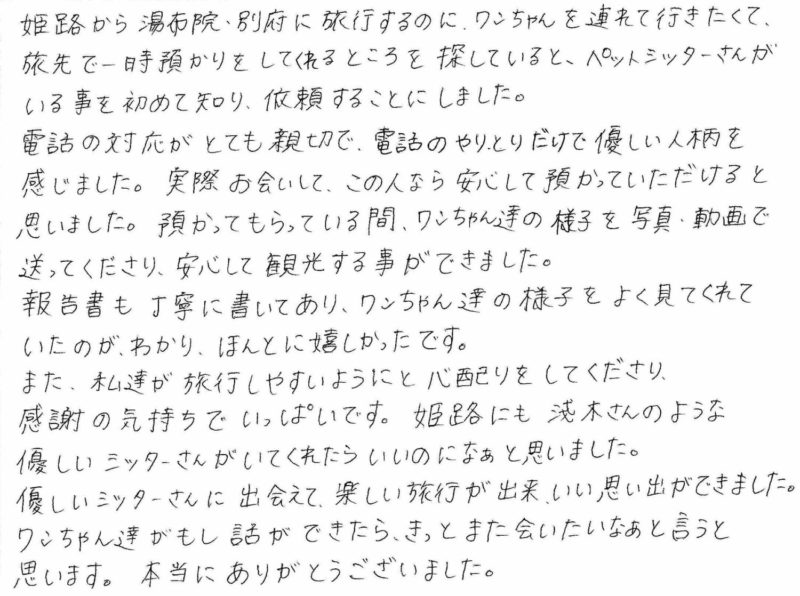 姫路にも淺木さんのような優しいシッターさんがいてくれたらいいのいなぁと思いました。優しいシッターさんに出会えて、楽しい旅行が出来、いい思い出ができました。ワンちゃん達がもし話ができたら、きっとまた会いたいなぁと言うと思います。本当にありがとうございました。