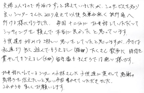 夫婦2人なので外泊はずっと控えていましたが、このサービスを知り良いシッターさんに巡り合えて以後、気兼ねなく旅行等へ行ける様になりました。毎回十二分にお世話していただいて、シッティングを頼んで本当に良かったと思っています。