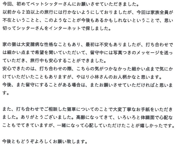 家の猫は大変臆病な性格なこともあり、最初は不安もありましたが、打ち合わせでは細かい点まで希望を聞いていただいて、留守中には写真つきのメッセージを送っていただき、旅行中も安心することができました。