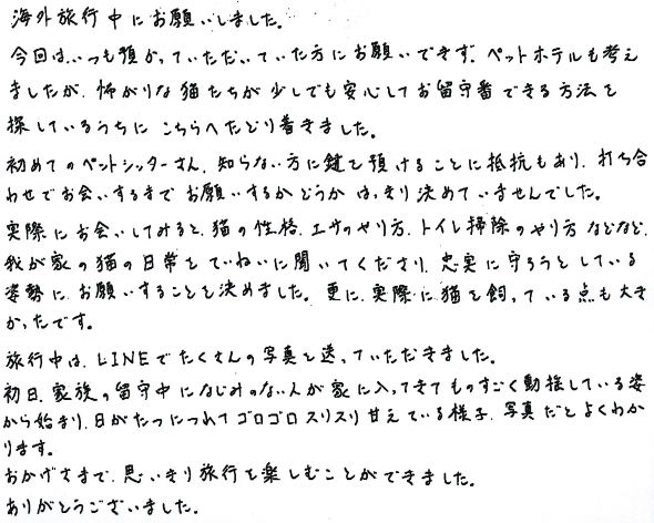 実際にお会いしてみると、猫の性格、エサのやり方、トイレ掃除のやり方などなど、我が家の猫の日常をていねいに聞いてくださり、忠実に守ろうとしている姿勢にお願いすることを決めました。更に実際に猫を飼っている点も大きかったです。