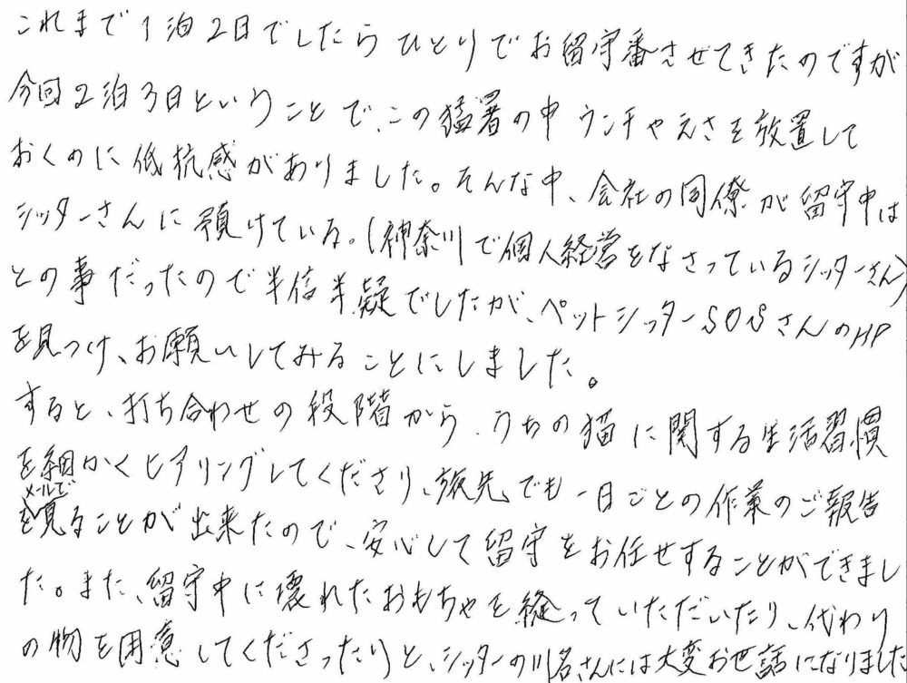 そんな中、会社の同僚が留守中はシッターさんに預けている。(神奈川で個人経営をなさっているシッターさん)とのことだったので半信半疑でしたが、ペットシッターSOSさんのHPを見つけ、お願いしてみることにしました。