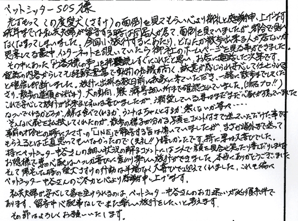 先ずもって、この度愛犬(さすけ)の面倒を見てもらい心より御礼と感謝申し上げます。去年までは私ども夫婦が留守する時は同居人が居て、面倒を見ていましたが、都合で見れなくなってしまいました。今回小旅行するにあたり、どなたか散歩出来る人が居ないか思案してる最中、インターネットを覗いていたら御社のホームページを見る事ができました。その中にあった「お客様の声」を拝読し、すぐにこれだと思い、お店に電話した次第です。