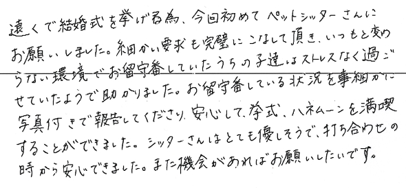 遠くで結婚式を挙げる為、今回初めてペットシッターさんにお願いしました。