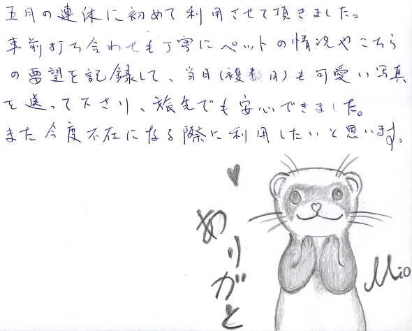 事前打ち合わせも丁寧にペットの状況やこちらの要望を記録して、当日(複数日)も可愛い写真を送って下さり、旅先でも安心できました。