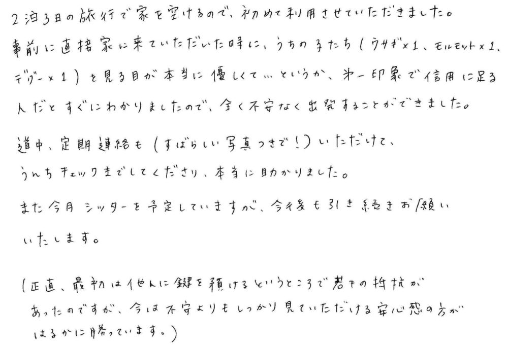 事前に直接家に来ていただいた時に、うちの子たち(ウサギ×1、モルモット×1、デグー×1)を見る目が本当に優しくて…というか、第一印象で信用に足る人だとすぐにわかりましたので、全く不安なく出発することができました。