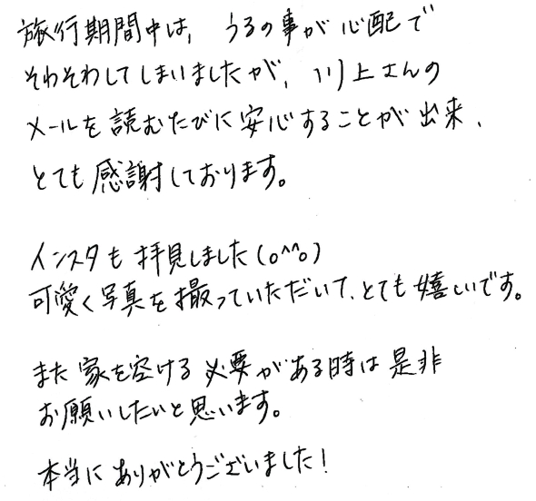 また家を空ける必要がある時は是非お願いしたいと思います。