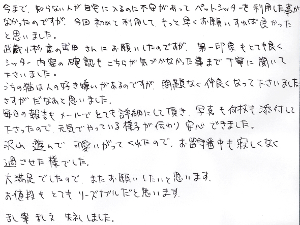 武蔵小杉店の武田さんにお願いしたのですが、第一印象もとても良く、シッター内容の確認もこちらが気づかなかった事まで丁寧に聞いて下さいました。うちの猫は人の好き嫌いがあるのですが、問題なく仲良くなって下さいました。さすがだなあと思いました。毎日の報告もメールでとても詳細にして頂き、写真も何枚も添付して下さったので、元気でやっている様子が伝わり安心できました。沢山遊んで可愛がってくれたので、お留守番中も寂しくなく過ごせた様でした。