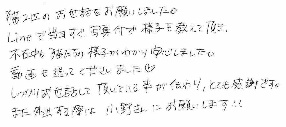 LINEで当日すぐ写真付で様子を教えて頂き、不在中も猫たちの様子がわかり安心しました。