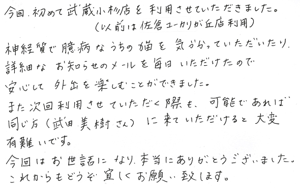 今回、初めて武蔵小杉店を利用させていただきました(以前は佐倉ユーカリが丘店利用)。神経質で臆病なうちの猫を気づかっていただいたり、詳細なお知らせのメールを毎日いただけたので安心して外出を楽しむことができました。