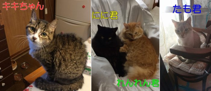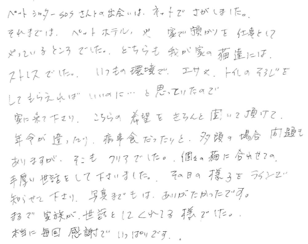 いつもの環境で、エサやトイレのそうじをしてもらえればいいのに…と思っていたので、家に来て下さり、こちらの希望をきちんと聞いて頂けて、年令が違ったり病事食だったりと、多頭の場合問題もありますが、そこもクリアでした。個々の猫に合わせての手厚い世話をして下さいました。