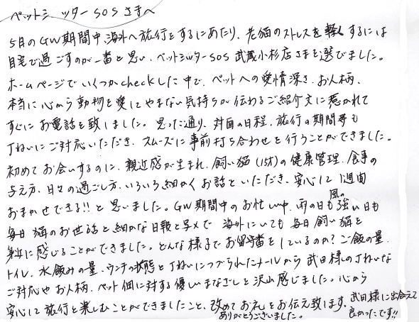 5日間のGW期間中、海外へ旅行をするにあたり、老猫のストレスを軽くするには自宅で過ごすのが一番と思い、ペットシッターSOS武蔵小杉店さまを選びました。