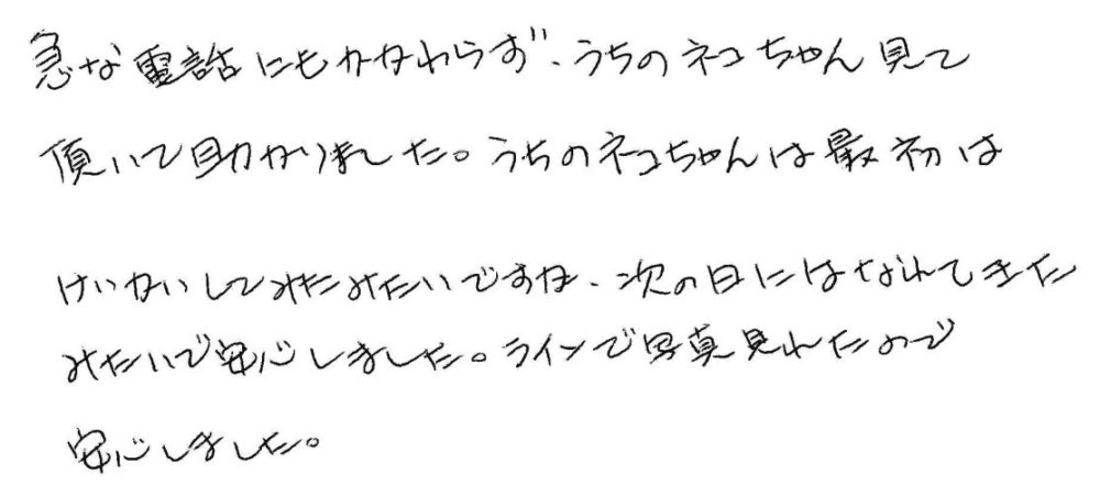 急な電話にもかかわらず、うちのネコちゃん見て頂いて助かりました。