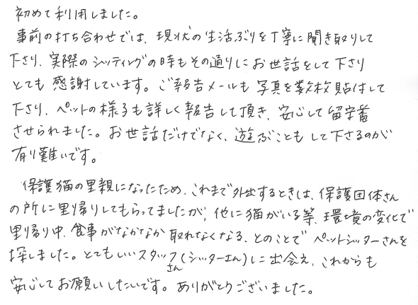 保護猫の里親になったため、これまで外出するときは、保護団体さんの所に里帰りしてもらってましたが、他に猫がいる等、環境の変化で里帰り中食事がなかなか取れなくなる、とのことでペットシッターさんを探しました。とてもいいスタッフさん(シッターさん)に出会え、これからも安心してお願いしたいです。ありがとうございました。