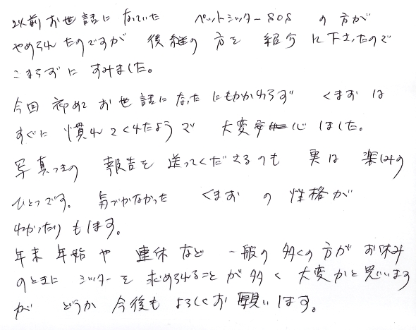 以前お世話になっていたペットシッターSOSの方がやめられたのですが、後継の方を紹介して下さったので困らずにすみました。