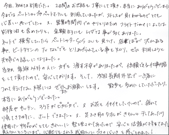 今回、初めての利用でした。2日間のお世話を丁寧にして頂き、本当にありがとうございました。