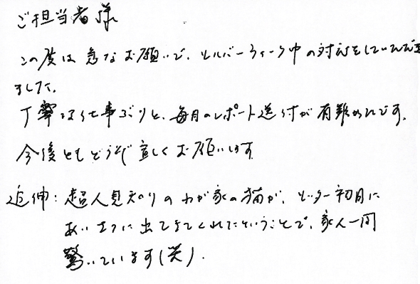 丁寧な仕事ぶりと、毎日のレポート送付が有難かったです。今後もどうぞ宜しくお願いします。
