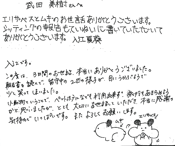 小動物ということで、ペットホテルなども利用出来ず、旅行もあきらめようかと思いましたが、とても大切にお世話していただき、本当に感謝の気持ちでいっぱいです。またよろしくお願いします。