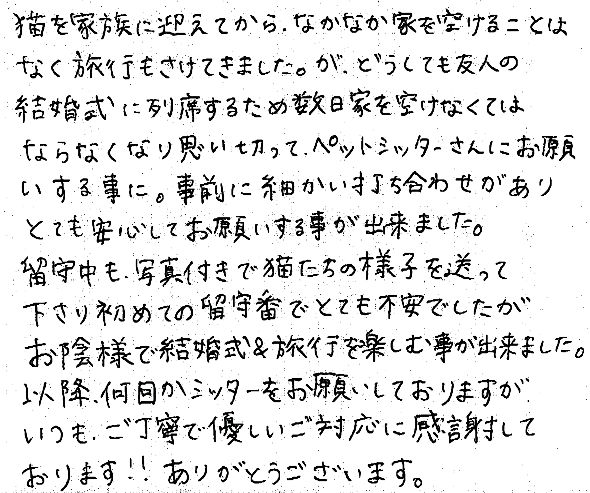 留守中も写真付きで猫たちの様子を送って下さり、初めての留守番でとても不安でしたが、お陰様で結婚式&旅行を楽しむ事が出来ました。