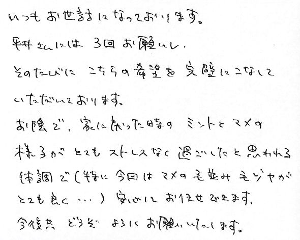 お陰で、家に戻った時のミントとマメの様子がとてもストレスな過ごしたと思われる体調で(特に今回はマメの毛並み毛ヅヤがとても良く・・)安心してお任せできます。