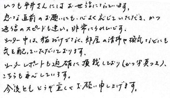 シッターレポートも適確に頂戴しており(かつ写真つき)、こちらも安心しています。