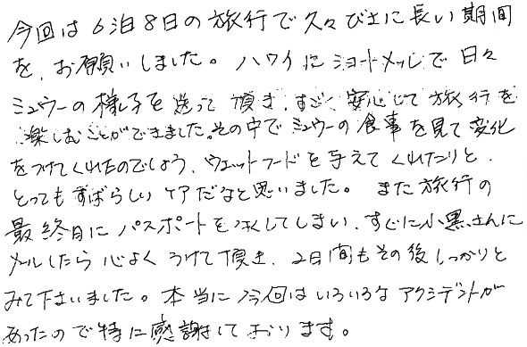 今回は6泊8日の旅行で久々に長い期間をお願いしました。ハワイにショートメールで日々ミュウーの様子を送って頂き、すごく安心して旅行を楽しむことができました。