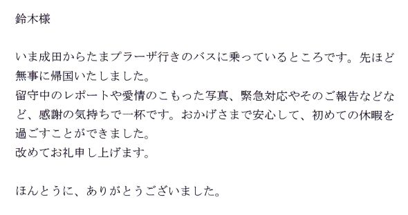 留守中のレポートや愛情のこもった写真、緊急対応やそのご報告などなど、感謝の気持ちで一杯です。おかげさまで安心して、初めての休暇を過ごすことができました。