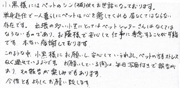 単身赴任で一人暮らしにペットは心を癒してくれる居なくてはならない存在です。出張の多い小生にとってはペットシッターさんはなくてはならないものであり、お蔭様で安心して仕事に専念することが可能です。本当に感謝しております。