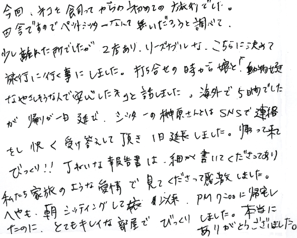 海外で5日間でしたが帰りが一日延び、シッターの榊原さんとはSNSで連絡をし快く受け答えして頂き1日延長しました。