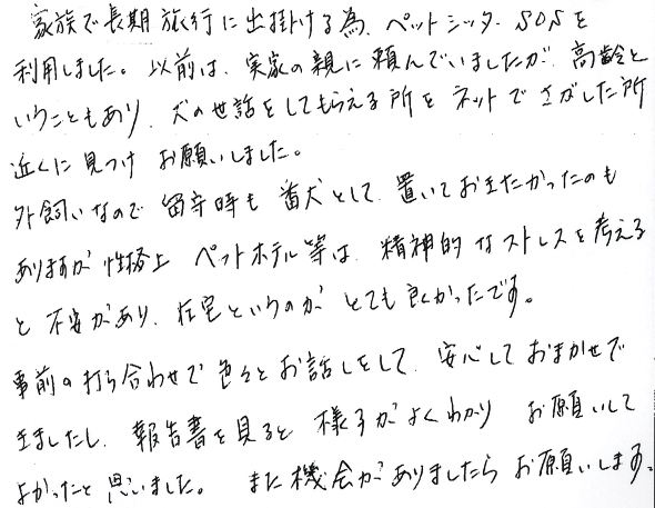 家族で長期旅行に出掛ける為、ペットシッターSOSを利用しました。以前は、実家の親に頼んでいましたが、高齢ということもあり、犬の世話をしてもらえる所をネットでさがした所近くに見つけお願いしました。