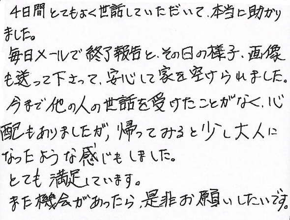 今まで他の人の世話を受けたことがなく、心配もありましたが、帰ってみると少し大人になったような感じもしました。