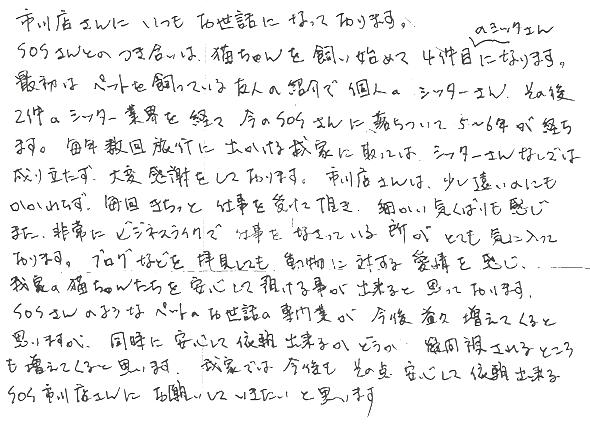 市川店さんに、いつもお世話になっております。SOSさんとのつき合いは、猫ちゃんを飼い始めて4件目のシッターさんになります。