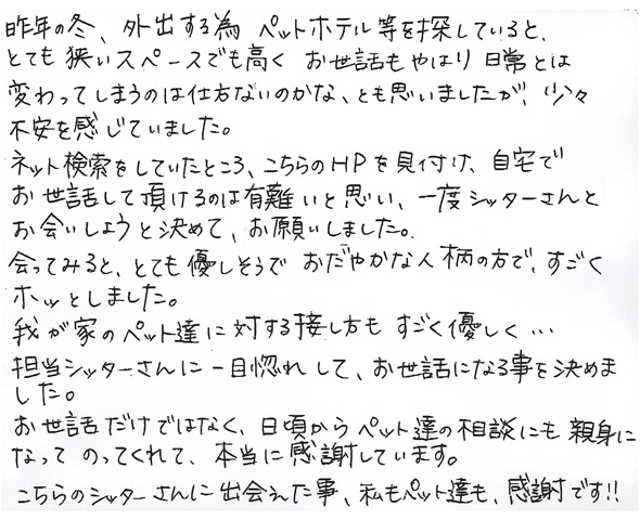 昨年の冬、外出する為ペットホテル等を探していると、とても寒いスペースでも高く、お世話もやはり日常とは変わってしまうのは仕方ないのかな、と思いましたが、少々不安を感じていました。ネット検索をしていたところ、こちらのHPを見付け、自宅でお世話して頂けるのは有難いと思い、一度シッターさんとお会いしようと決めて、お願いしました。