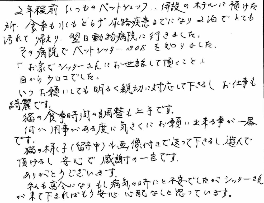 私も高齢になり、もし病気の時にと不安でしたが、シッターさんが来て下さればもう安心、心配なしと思っています。