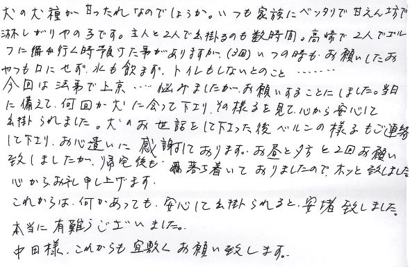今回は法事で上京・・・悩みましたが、お願いすることにしました。当日に備えて、何回か犬に会って下さり、その様子を見て心から安心して出掛けられました。犬のお世話をして下さった後ベルンの様子もご連絡して下さり、お心遣いに感謝しております。お昼と夕方と2回お願い致しましたが、帰宅後も落ち着いておりましたので、ホッと致しました。心からお礼申し上げます。これからは、何かあっても安心して出掛けられると、安堵致しました。本当に有難うございました。中田様、これからも宜しくお願い致します。