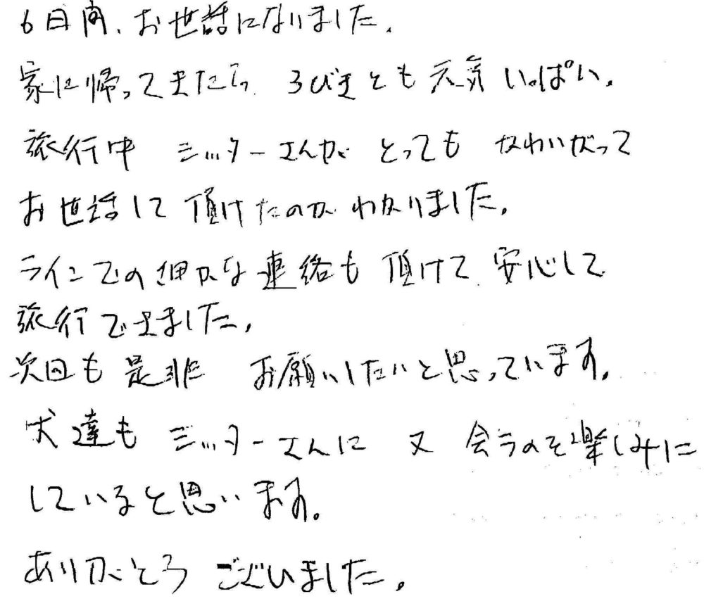 犬達もシッターさんに又会うのを楽しみにしていると思います。