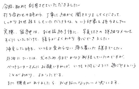 今回、初めて利用させていただきました。打ち合わせの時から、丁寧に細かく聞きとりをしてくださって、しっかりお世話をしていただけるな、という印象を持ちました。実際、留守中は、お世話終了後に写真付きの詳細なメールをすぐにいただけて、様子がよくわかり安心できました。帰宅した時も、いつもと変わらない落ち着いた様子でした。