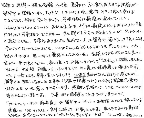 感謝の気持ちはとてもこのスペースには書ききれない程です。正直、他の店舗のことはわかりませんが、「ペットシッターSOS高崎店」は留守中のペットのお世話について悩んでいる皆様に100%の自信を持ってお勧めします。来て下さるのは動物好きのお兄さんではなく〝ペットシッティングのプロ”なんです。本当に。。。