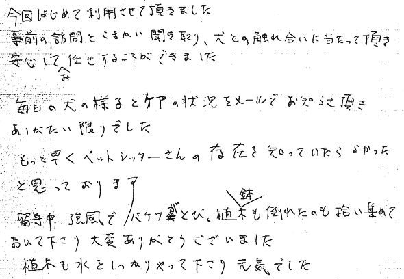 今回はじめて利用させて頂きました。事前の訪問とこまかい聞き取り、犬との触れ合いに当たって頂き安心してお任せすることができました。毎日の犬の様子とケアの状況をメールでお知らせ頂き、ありがたい限りでした。もっと早くペットシッターさんの存在を知っていたらよかったと思っております。留守中強風でバケツがとび、植木鉢も倒れたのも拾い集めておいて下さり、大変ありがとうございました。植木も水をしっかりやって下さり元気でした。